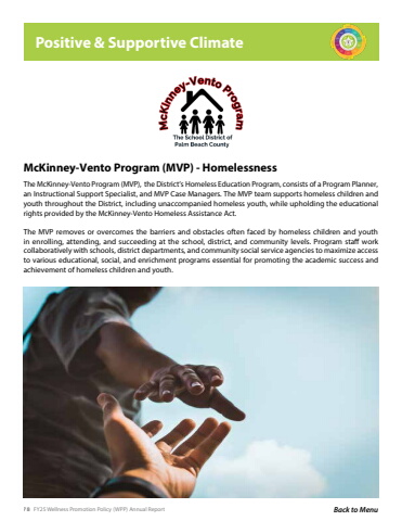 78 FY25 Wellness Promotion Policy (WPP) Annual Report Back to MenuMcKinney-Vento Program (MVP) - HomelessnessThe McKinney-Vento Program (MVP), the District%u2019s Homeless Education Program, consists of a Program Planner, an Instructional Support Specialist, and MVP Case Managers. The MVP team supports homeless children and youth throughout the District, including unaccompanied homeless youth, while upholding the educational rights provided by the McKinney-Vento Homeless Assistance Act. The MVP removes or overcomes the barriers and obstacles often faced by homeless children and youth in enrolling, attending, and succeeding at the school, district, and community levels. Program staff work collaboratively with schools, district departments, and community social service agencies to maximize access to various educational, social, and enrichment programs essential for promoting the academic success and achievement of homeless children and youth. Positive & Supportive Climate