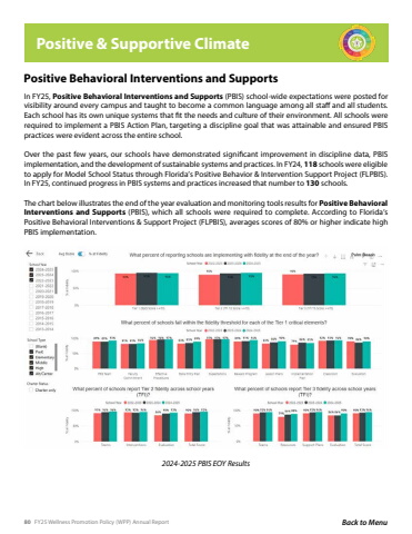 80 FY25 Wellness Promotion Policy (WPP) Annual Report Back to MenuPositive Behavioral Interventions and SupportsIn FY25, Positive Behavioral Interventions and Supports (PBIS) school-wide expectations were posted for visibility around every campus and taught to become a common language among all staff and all students. Each school has its own unique systems that fit the needs and culture of their environment. All schools were required to implement a PBIS Action Plan, targeting a discipline goal that was attainable and ensured PBIS practices were evident across the entire school. Over the past few years, our schools have demonstrated significant improvement in discipline data, PBIS implementation, and the development of sustainable systems and practices. In FY24, 118 schools were eligible to apply for Model School Status through Florida%u2019s Positive Behavior & Intervention Support Project (FLPBIS). In FY25, continued progress in PBIS systems and practices increased that number to 130 schools.The chart below illustrates the end of the year evaluation and monitoring tools results for Positive Behavioral Interventions and Supports (PBIS), which all schools were required to complete. According to Florida%u2019s Positive Behavioral Interventions & Support Project (FLPBIS), averages scores of 80% or higher indicate high PBIS implementation.Positive & Supportive Climate2024-2025 PBIS EOY Results