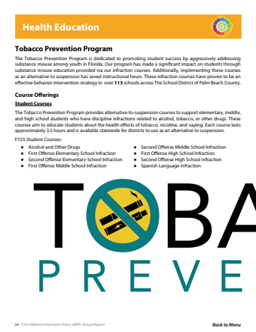 86 FY25 Wellness Promotion Policy (WPP) Annual Report Back to MenuTobacco Prevention ProgramThe Tobacco Prevention Program is dedicated to promoting student success by aggressively addressing substance misuse among youth in Florida. Our program has made a significant impact on students through substance misuse education provided via our infraction courses. Additionally, implementing these courses as an alternative to suspension has saved instructional hours. These infraction courses have proven to be an effective behavior intervention strategy in over 113 schools across The School District of Palm Beach County.Course OfferingsStudent CoursesThe Tobacco Prevention Program provides alternative-to-suspension courses to support elementary, middle, and high school students who have discipline infractions related to alcohol, tobacco, or other drugs. These courses aim to educate students about the health effects of tobacco, nicotine, and vaping. Each course lasts approximately 3.5 hours and is available statewide for districts to use as an alternative to suspension.FY25 Student Courses:Health Education%u25cf Alcohol and Other Drugs%u25cf First Offense Elementary School Infraction%u25cf Second Offense Elementary School Infraction%u25cf First Offense Middle School Infraction%u25cf Second Offense Middle School Infraction%u25cf First Offense High School Infraction%u25cf Second Offense High School Infraction%u25cf Spanish Language Infraction