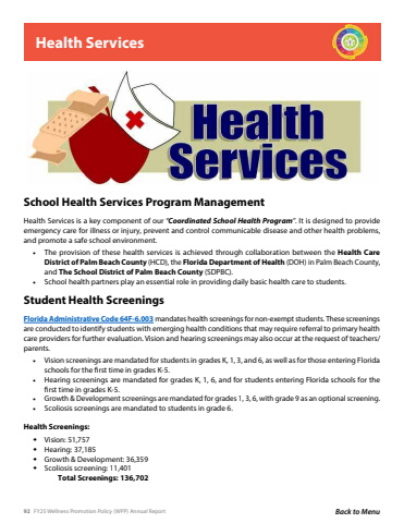 92 FY25 Wellness Promotion Policy (WPP) Annual Report Back to MenuHealth ServicesHealth Services is a key component of our %u201cCoordinated School Health Program%u201d. It is designed to provide emergency care for illness or injury, prevent and control communicable disease and other health problems, and promote a safe school environment. %u2022 The provision of these health services is achieved through collaboration between the Health Care District of Palm Beach County (HCD), the Florida Department of Health (DOH) in Palm Beach County, and The School District of Palm Beach County (SDPBC).%u2022 School health partners play an essential role in providing daily basic health care to students.Florida Administrative Code 64F-6.003 mandates health screenings for non-exempt students. These screenings are conducted to identify students with emerging health conditions that may require referral to primary health care providers for further evaluation. Vision and hearing screenings may also occur at the request of teachers/parents. %u2022 Vision screenings are mandated for students in grades K, 1, 3, and 6, as well as for those entering Florida schools for the first time in grades K-5. %u2022 Hearing screenings are mandated for grades K, 1, 6, and for students entering Florida schools for the first time in grades K-5. %u2022 Growth & Development screenings are mandated for grades 1, 3, 6, with grade 9 as an optional screening. %u2022 Scoliosis screenings are mandated to students in grade 6.Health Screenings:%u008a Vision: 51,757%u008a Hearing: 37,185%u008a Growth & Development: 36,359%u008a Scoliosis screening: 11,401 Total Screenings: 136,702School Health Services Program ManagementStudent Health Screenings