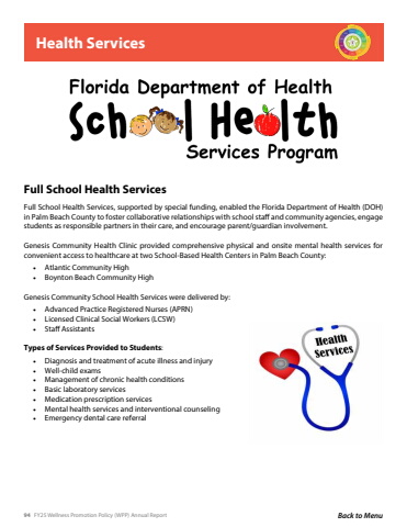 94 FY25 Wellness Promotion Policy (WPP) Annual Report Back to MenuHealth ServicesFull School Health Services, supported by special funding, enabled the Florida Department of Health (DOH) in Palm Beach County to foster collaborative relationships with school staff and community agencies, engage students as responsible partners in their care, and encourage parent/guardian involvement. Genesis Community Health Clinic provided comprehensive physical and onsite mental health services for convenient access to healthcare at two School-Based Health Centers in Palm Beach County:%u2022 Atlantic Community High%u2022 Boynton Beach Community High Genesis Community School Health Services were delivered by:%u2022 Advanced Practice Registered Nurses (APRN)%u2022 Licensed Clinical Social Workers (LCSW)%u2022 Staff AssistantsTypes of Services Provided to Students:%u2022 Diagnosis and treatment of acute illness and injury%u2022 Well-child exams%u2022 Management of chronic health conditions%u2022 Basic laboratory services%u2022 Medication prescription services%u2022 Mental health services and interventional counseling%u2022 Emergency dental care referralFull School Health Services