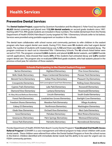 96 FY25 Wellness Promotion Policy (WPP) Annual Report Back to MenuHealth ServicesThe Dental Sealant Project, supported by Quantum Foundation and the Marjorie S. Fisher Fund, has provided 46,623 dental screenings and placed over 112,584 dental sealants on second grade students since 1997. Starting with FY23, fifth grade students are included in these numbers. The mobile dental team from the Florida Department of Health (FDOH) Palm Beach County targeted 42 Title 1 Elementary Schools (refer to list below). Services were provided using portable equipment on location in the schools.The dental team collaborates with school nurses and community partners to refer children in the sealant program who have urgent dental care needs. During FY25, there were 93 students who had urgent dental needs. The number of students with treated decay was 1,153 and there were 823 with untreated decay. The program continues to reach out to interested Title 1 Elementary Schools. The 42 schools listed below were served in FY25. The program screened 3,304 students and placed 4,329 dental sealants, and 2,823 fluoride varnish applications. Data showed that nearly 25% of the students had untreated decay and 2.8% needed urgent dental care. The program also re-evaluated 374 third grade students, who had sealants placed in the previous school year, for retention of those sealants.Preventive Dental ServicesFlorida Department of Health (FDOH) Palm Beach County Dental Program%u2019s %u201cCoordinated Oral Health Access Referral Program%u201d (COHARP) is a case management and referral program to help school children with acute dental needs. These children were referred from either the Dental Sealant Program or from the school nurses in the District. Children identified with immediate dental needs had the ability to be seen for urgent care via FDOH community partners.Schools Participating in the Dental Sealant ProgramBarton Elementary Highland Elementary Pine Grove ElementaryBelle Glade Elementary Hope-Centennial Elementary Pioneer Park ElementaryBenoist Farms Elementary Indian Pines Elementary Pleasant City ElementaryCrosspointe Elementary K/E Cunningham/Canal Point Elementary Rolling Green ElementaryCypress Trails Elementary Lake Park Elementary Roosevelt ElementaryDiamond View Elementary Lantana Elementary Rosenwald ElementaryDr. Mary McLeod Bethune Elementary Lincoln Elementary South Grade ElementaryForest Park Elementary Loxahatchee Groves Elementary Starlight Cove ElementaryFreedom Shores Elementary Meadow Park Elemenatry Village AcademyGalaxy E3 Elementary Northmore Elementary Washington ElementaryGlade View Elementary Orchard View Elementary West Gate ElementaryGove Elementary Pahokee Elementary West Riviera ElementaryGreenacres Elementary Palm Springs Elementary Westward Elementary Grove Park Elementary Palmetto Elementary Wynnebrook Elementary