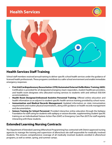 97Health ServicesThe Department of Extended Learning (Afterschool Programming) has contracted with District approved nursing agencies to manage the training and supervision of afterschool site staff responsible for medically involved students. This ensures comprehensive coverage of all medically involved students enrolled in afterschool programs, as well as winter, spring, and summer camps.School staff members received annual training to deliver specific school health services under the guidance of licensed health professionals. These programs contribute to a safer school environment and enable immediate emergency responses:%u2022 First Aid/Cardiopulmonary Resuscitation (CPR)/Automated External Defibrillator Training (AED): Certification is provided for all designated emergency team responders, student healthcare providers, and health room designees who allocated nursing services to students with and without ESE/504 accommodations. %u2022 Health Room Designee/Unlicensed Assistive Personnel Training: Offered online education and health information as an adjunct to student-specific health services training provided by school nurse. %u2022 Immunization and Medical Records Management: Updated information on state immunization requirements and routine physical examinations, along with guidance on health records management and documentation. %u2022 Seizure Training for School Personnel: Provided interactive online education through the Epilepsy Foundation for staff caring for students with epilepsy or seizure disorder, supplementing student-specific training on an Individualized Seizure Action Plan (ISAP) or Emergency Care Plan (ECP) for staff regularly interacting with these students.Health Services Staff TrainingExtended Learning Nursing Contracts