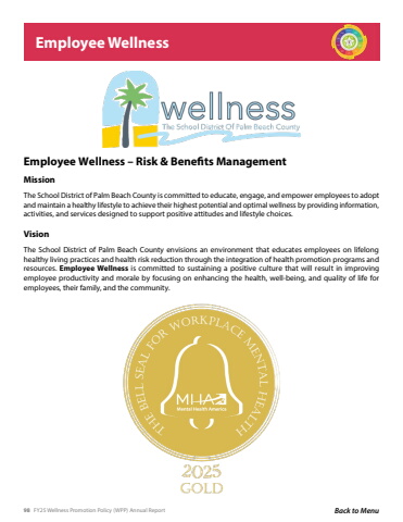 98 FY25 Wellness Promotion Policy (WPP) Annual Report Back to MenuEmployee WellnessMissionThe School District of Palm Beach County is committed to educate, engage, and empower employees to adopt and maintain a healthy lifestyle to achieve their highest potential and optimal wellness by providing information, activities, and services designed to support positive attitudes and lifestyle choices.VisionThe School District of Palm Beach County envisions an environment that educates employees on lifelong healthy living practices and health risk reduction through the integration of health promotion programs and resources. Employee Wellness is committed to sustaining a positive culture that will result in improving employee productivity and morale by focusing on enhancing the health, well-being, and quality of life for employees, their family, and the community.Employee Wellness %u2013 Risk & Benefits Management