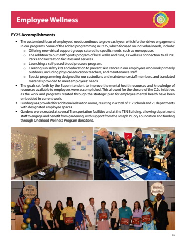 99FY25 Accomplishments%u008a The customized focus of employees%u2019 needs continues to grow each year, which further drives engagement in our programs. Some of the added programming in FY25, which focused on individual needs, include: o Offering new virtual support groups catered to specific needs, such as menopause. o The addition to our Staff Sports program of local walks and runs, as well as a connection to all PBC Parks and Recreation facilities and services.o Launching a self-paced blood pressure program. o Creating sun safety kits and education to prevent skin cancer in our employees who work primarily outdoors, including physical education teachers, and maintenance staff.o Special programming designed for our custodians and maintenance staff members, and translated materials provided to meet employees%u2019 needs. %u008a The goals set forth by the Superintendent to improve the mental health resources and knowledge of resources available to employees were accomplished. This allowed for the closure of the C.2c initiative, as the work and programs created through the strategic plan for employee mental health have been embedded in current work. %u008a Funding was provided for additional relaxation rooms, resulting in a total of 117 schools and 25 departments with designated employee spaces.%u008a Gardens were created at several Transportation facilities and at the TEN Building, allowing department staff to engage and benefit from gardening, with support from the Joseph P Cory Foundation and funding through OneBlood Wellness Program donations.Employee Wellness