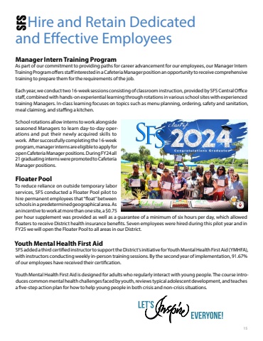 15Manager Intern Training Program As part of our commitment to providing paths for career advancement for our employees, our Manager Intern Training Program offers staff interested in a Cafeteria Manager position an opportunity to receive comprehensive training to prepare them for the requirements of the job. Each year, we conduct two 16-week sessions consisting of classroom instruction, provided by SFS Central Office staff, combined with hands-on experiential learning through rotations in various school sites with experienced training Managers. In-class learning focuses on topics such as menu planning, ordering, safety and sanitation, meal claiming, and staffing a kitchen. School rotations allow interns to work alongside seasoned Managers to learn day-to-day operations and put their newly acquired skills to work. After successfully completing the 16-week program, manager interns are eligible to apply for open Cafeteria Manager positions. During FY24 all 21 graduating interns were promoted to Cafeteria Manager positions.Floater PoolTo reduce reliance on outside temporary labor services, SFS conducted a Floater Pool pilot to hire permanent employees that %u201cfloat%u201d between schools in a predetermined geographical area. As an incentive to work at more than one site, a $0.75 per hour supplement was provided as well as a guarantee of a minimum of six hours per day, which allowed floaters to receive District health insurance benefits. Seven employees were hired during this pilot year and in FY25 we will open the Floater Pool to all areas in our District.Youth Mental Health First AidSFS added a third certified instructor to support the District%u2019s initiative for Youth Mental Health First Aid (YMHFA), with instructors conducting weekly in-person training sessions. By the second year of implementation, 91.67% of our employees have received their certification.Youth Mental Health First Aid is designed for adults who regularly interact with young people. The course introduces common mental health challenges faced by youth, reviews typical adolescent development, and teaches a five-step action plan for how to help young people in both crisis and non-crisis situations.Hire and Retain Dedicatedand Effective Employees