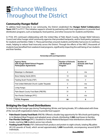 22 School Food Service 2023-2024 Annual ReportCommunity Hunger ReliefTable 1Partnerships with Local OrganizationsTo address food insecurity in our community, the District established the Hunger Relief Collaboration Team (HRCT) in FY17. This initiative supports schools by partnering with local organizations to provide food distribution programs, such as backpacks, food pantries, and other resources for students and families.In FY24, SFS continued collaborating with the United Way of Palm Beach County, Hunger Relief Advisory Council and other hunger relief community agencies that provided backpacks, and/or food pantry programs for students and families (Table 1). These partnerships ensured students and families had access to nutritious meals, helping to reduce food insecurity across the District. Through the efforts of the HRCT, thousands of students have benefited from weekend meal programs, significantly impacting the well-being of our students and their families.Enhance Wellness Throughout the District%u2022 Palm Beach County Food Bank (PBCFB): Offered a double-bag opportunity for 15 schools participating in its Weekend Meal Program and adopted seven schools, distributing 1,584 meal boxes to families.%u2022 Pan-Florida Challenge (PFC): Doubled its Family Weekend Backpack meal distributions ahead of the breaks, reaching 168 students across two schools.%u2022 Feeding South Florida (FSF): Delivered fresh produce and protein to eight schools, totaling 72 pallets (81,535 pounds of food), which served approximately 1,409 households, encompassing around 5,171 individuals.MainMENUBridging the Gap Food DistributionsTo help bridge the hunger gap during Thanksgiving, Winter, and Spring breaks, SFS collaborated with three of the non-profit organizations below to provide food support: